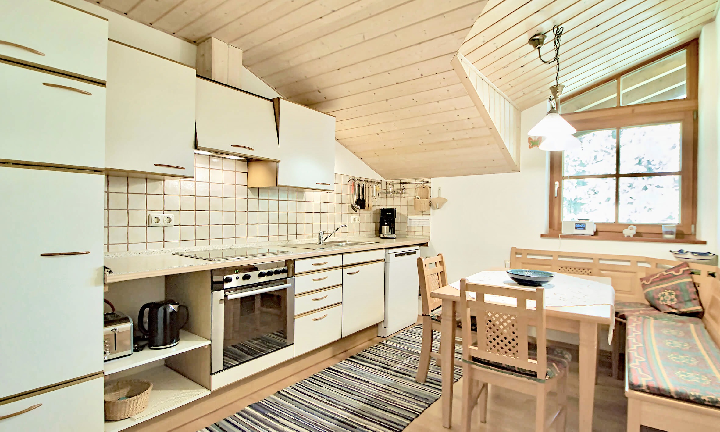 Wohnküche: komplett ausgestattete Küchenzeile mit Spülmaschine, Kühlschrank mit separatem Gefrierschrank, große Essecke mit ausziehbarem Tisch.