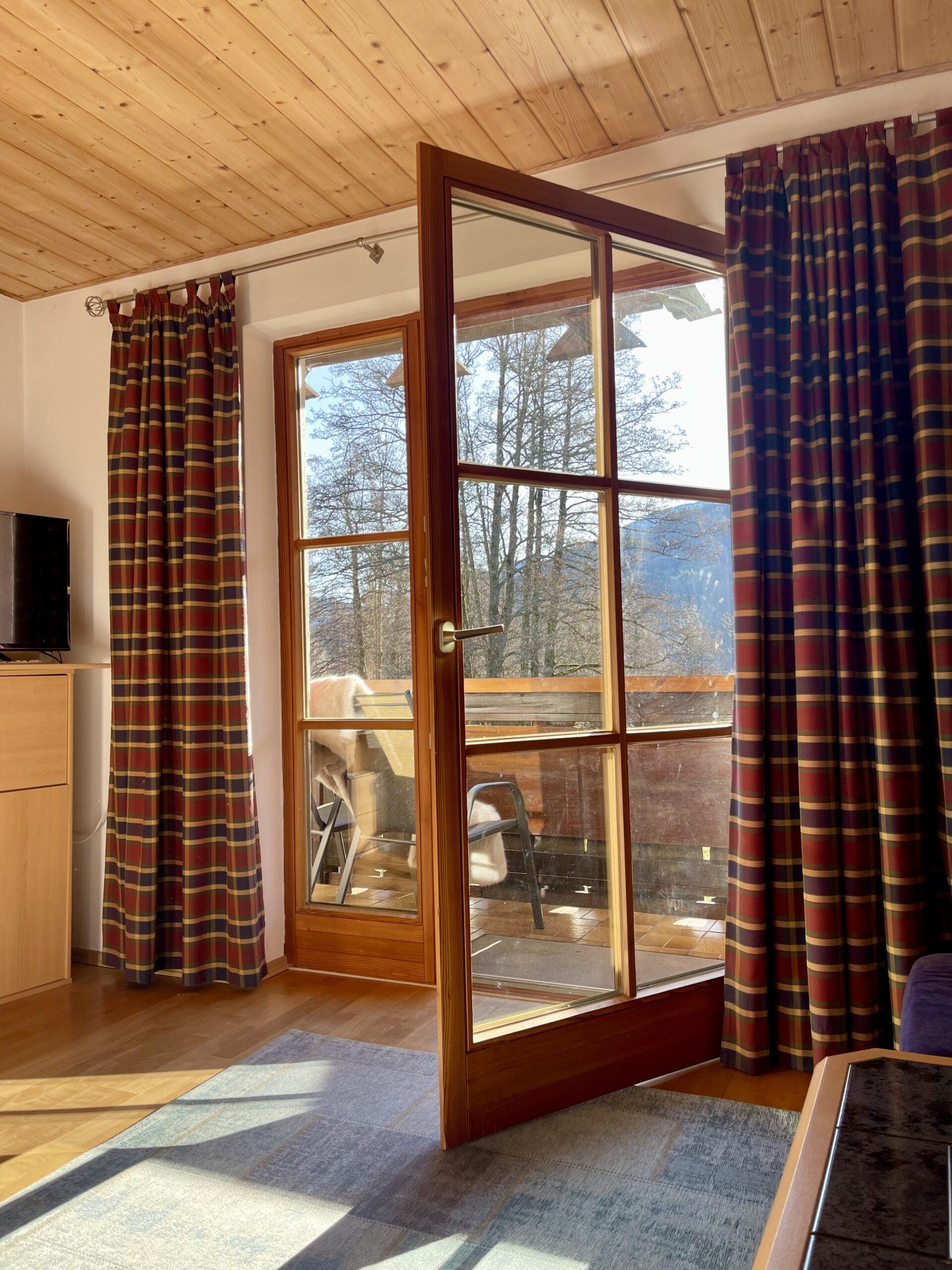 Von einem geräumigen Flur gehen Sie in die verschiedenen Räume. Die ganze Wohnung ist mit Holzdecken getäfelt, der Boden ist durchgehend mit gewachstem Parkett verlegt. Dadurch hat die Wohnung ein natürliches und gesundes Raumklima.